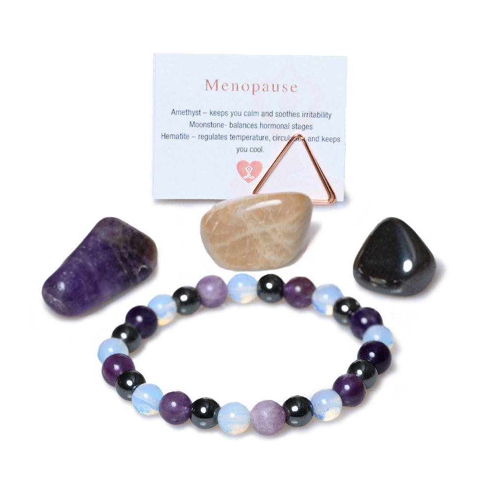 The Menopause Crystal Kit is an addition and can be purchased along side the bracelet. Each crystal kit contains 1x Amethyst, 1x Moonstone 1x Hematite and comes with a detailed crystal care guide on how to clean, use and charge them.