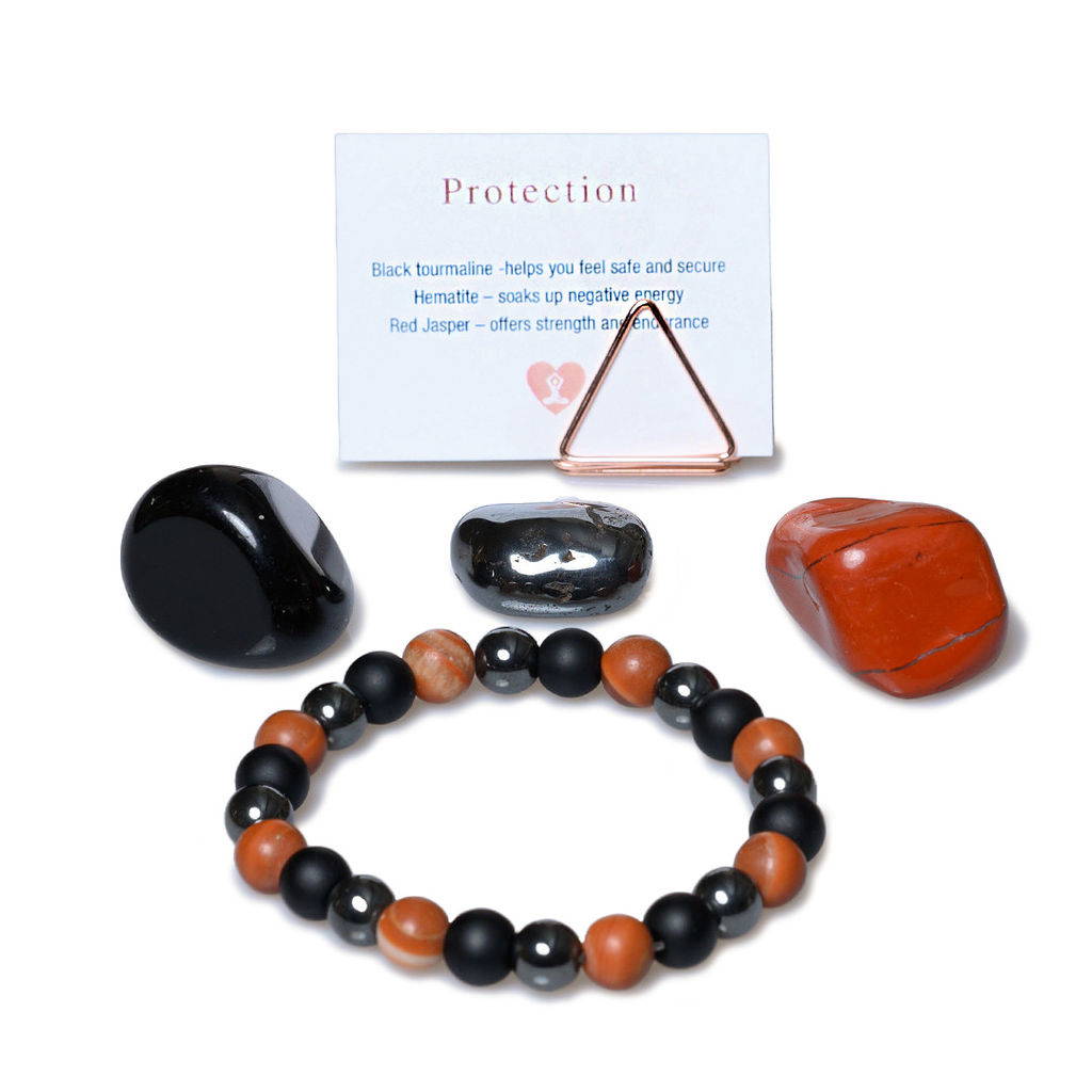 The Proection Crystal Kit is an addition and can be purchased along side the bracelet. Each crystal kit contains 1x Black Tourmaline, 1x Red Jasper 1x Hematite and comes with a detailed crystal care guide on how to clean, use and charge them.